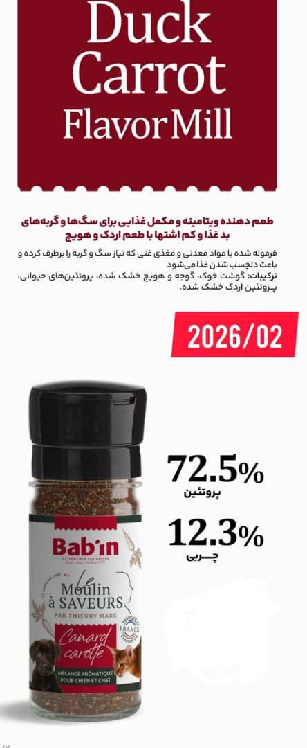 ادویه و مکمل غذای سگ و گربه طعم اردک و هویج فرنگی برند بابین فرانسه، با طعم لذیذ و خوشمزه اش تهیه شده تا نیازهای سگ ها و گربه های بد غذا را، برآورده کند.