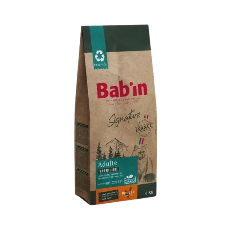 غذای خشک گربه بالغ عقیم شده poulet با طعم مرغ برند بابین، غنی از مرغ، یک غذای بسیار قابل هضم است.
